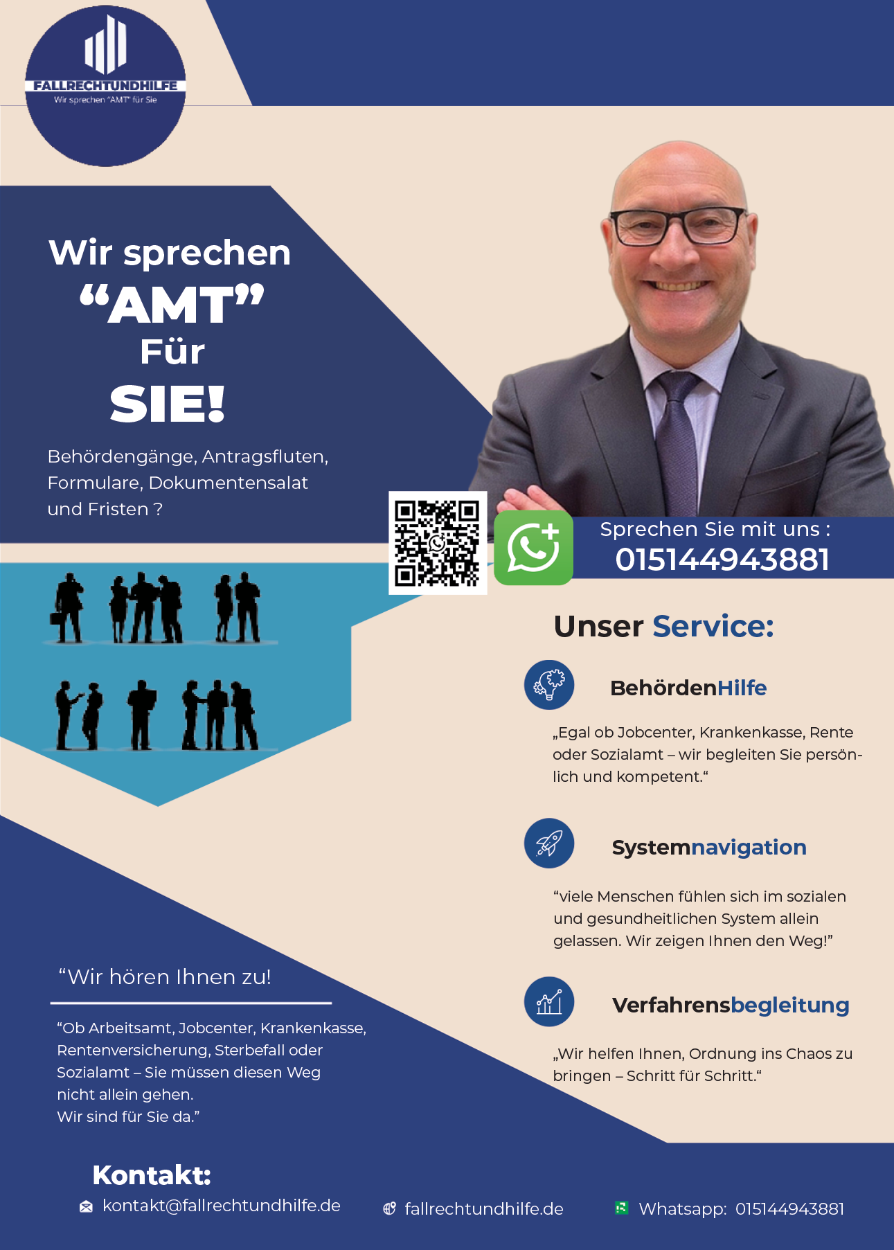 (1) Der Anbieter bietet praxisnahe Unterstützung in sozialen und behördlichen Angelegenheiten an, insbesondere durch: • Systemnavigation (z. B. Begleitung durch Sozial- und Gesundheitssysteme) • Behördenhilfe (z. B. Schriftverkehr, Antragstellungen, Begleitung zu Terminen) • Verfahrensbegleitung (z. B. bei Reha-, Renten-, Sozial-, Gesundheitsverfahren) • Fallanalyse & Krisenmanagement bei komplexen sozialen Notlagen